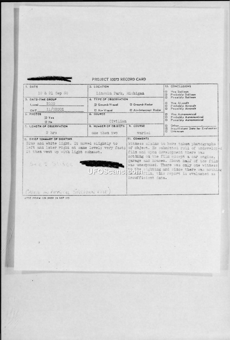Project 10073 Record Card — Lincoln Park, Michigan, 10 & 21 September 1960