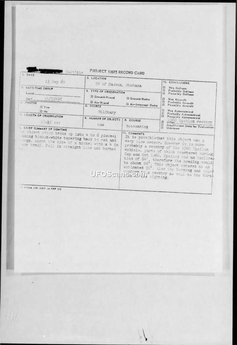 This document is a Project 10073 record card and accompanying intelligence report regarding an aerial sighting that occurred on September 13, 1960, southwest of Nashua, Montana. The object was observed by at least six aircrews and other observers, including a civilian pilot from the town of Vidaux. The object was described as breaking into four to six pieces, exhibiting a bluish-white color that tapered to red and orange, and appearing roughly the size of a nickel with a four-inch trail. The duration of the sighting was approximately 10 to 15 seconds, and the object was observed descending in a straight line before burning out. The official conclusion provided on the record card suggests the object was likely a very slow meteor or, more probably, the reentry of the 1960 Epsilon vehicle, which was known to have reentered the atmosphere during September and October 1960. Despite this official assessment, the investigating officer, 1st Lieutenant Myron W. Burr of the 15th Fighter Interceptor Squadron, expressed a personal conviction that the sighting was 'something more than a meteor.' This belief was based on the widespread nature of the observations and the perceived reliability of the witnesses involved. The report includes technical details such as the coordinates of the sighting (48°N - 106° 21'W) and confirms that no radar contact was made. The document also notes that a full list of observers was being maintained by the investigating officer for potential follow-up investigation.