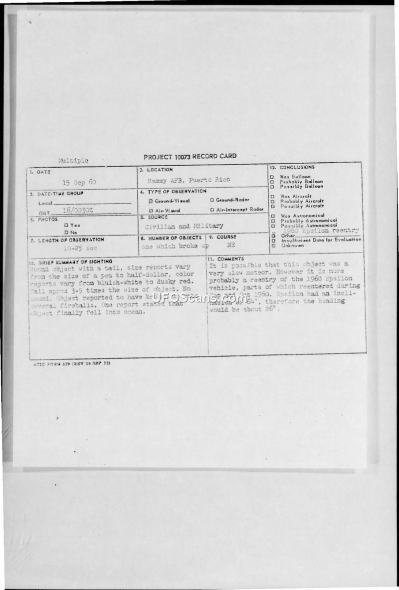This document collection comprises a series of incoming military messages and a Project 10073 record card detailing a significant aerial sighting event on September 15-16, 1960, over Puerto Rico and the Caribbean. Numerous observers, including military personnel at Ramey Air Force Base, civilian observers in San Juan, and crews aboard vessels such as the USNS Geiger and the MS Mormacwren, reported a bright, unidentified object or cluster of objects moving from south to north. Descriptions consistently characterized the phenomenon as a large, bright light or a round object with a long, reddish tail, which appeared to break up into approximately fifteen to twenty smaller fireballs or streaks. The duration of the sightings varied, with some reports indicating the objects were visible for 10 to 90 seconds. Military observers at Ramey AFB noted the objects appeared at an elevation of 45 to 80 degrees and moved in a straight, level flight path. Despite the high volume of reports, no radar contact was confirmed, and no physical evidence was recovered. The official evaluation, documented on the Project 10073 record card, suggests the phenomenon was likely a very slow meteor or, more probably, the atmospheric reentry of the 1960 Epsilon space vehicle. The report notes that Epsilon's orbital inclination of 64 degrees would result in a heading of approximately 26 degrees, which aligns with the observed trajectory. The documentation includes detailed interrogation summaries of military personnel, including a major, a master sergeant, and an aircraft maintenance superintendent, all of whom were considered reliable witnesses. The event was also cross-referenced with Project Moon Dust protocols. The reports emphasize that the objects passed directly over San Juan and were observed by multiple independent parties, including pilots and ground-based observers, reinforcing the consistency of the accounts despite the lack of physical or radar-based confirmation.