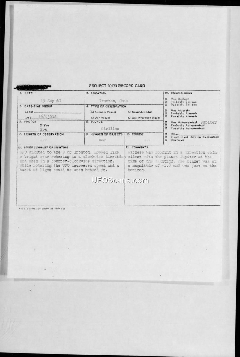 A sighting in Ironton, Ohio, on September 15, 1960, was officially identified as the planet Jupiter. The report includes summaries of other concurrent aerial observations investigated by the Air Force.