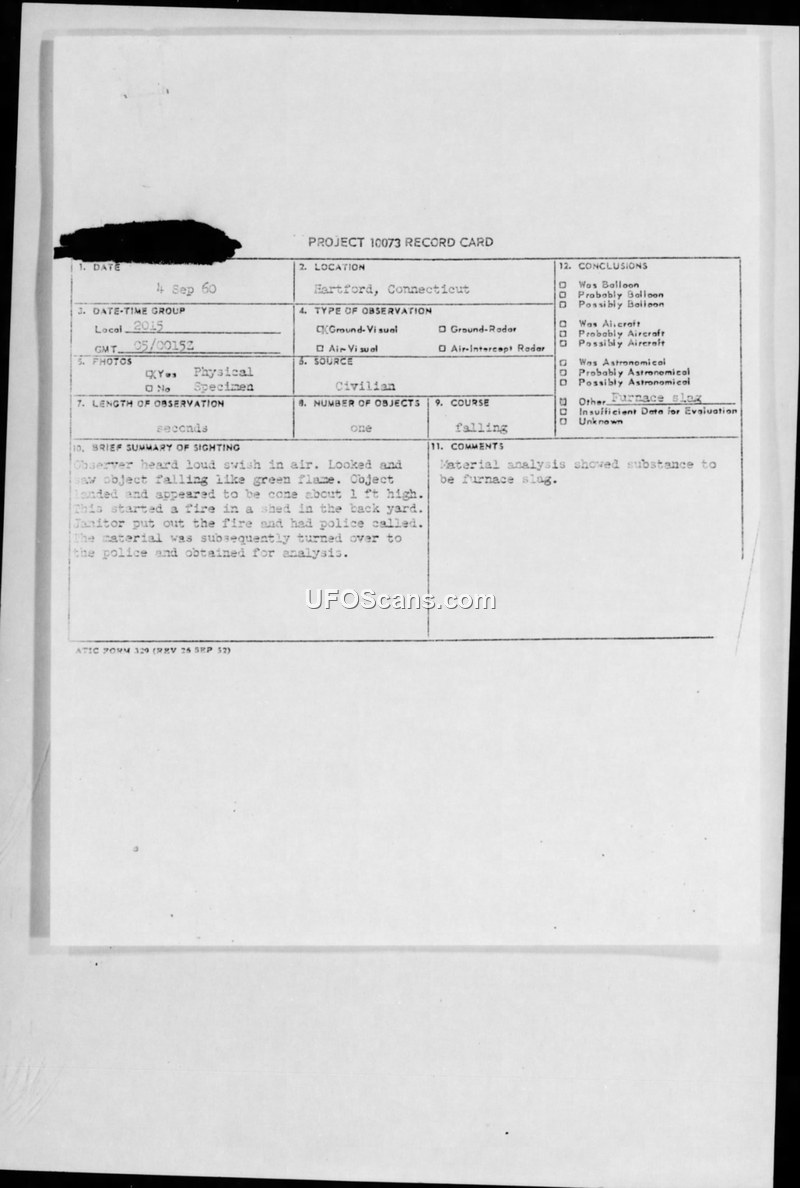 A reported aerial sighting in Hartford, Connecticut, in 1960 led to the recovery of material that was subsequently analyzed by multiple scientific and military agencies. The material was officially identified as furnace slag, and the investigation concluded it was not of meteoric origin.