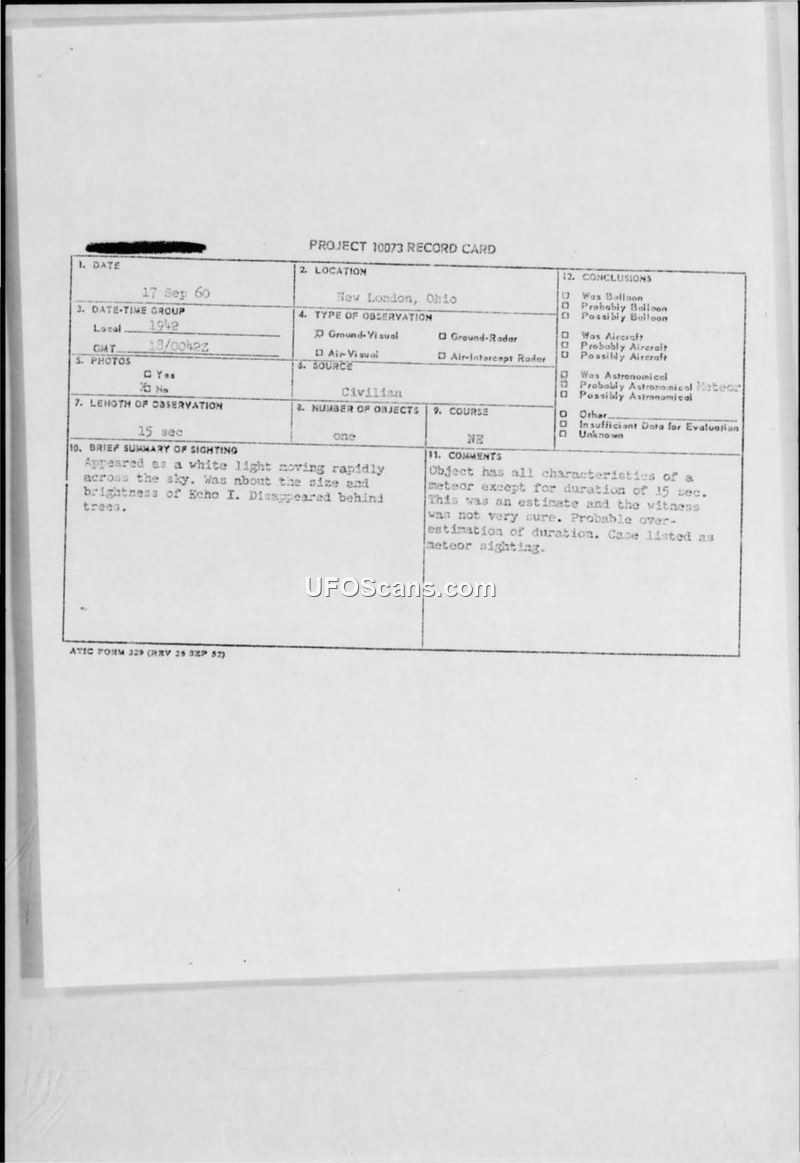 Project 10073 Record Card — New London, Ohio, 17 September 1960