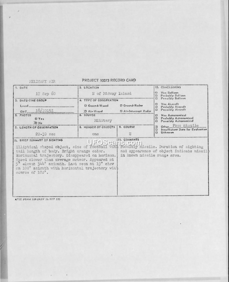 Project 10073 Record Card — Sighting near Midway Island, 17 September 1960
