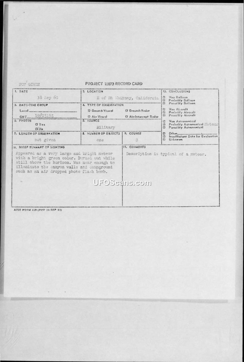 A sighting of a bright green, large meteor near Mt. Whitney, California, on September 18, 1960, was reported by military personnel. The event was officially classified as a meteor.