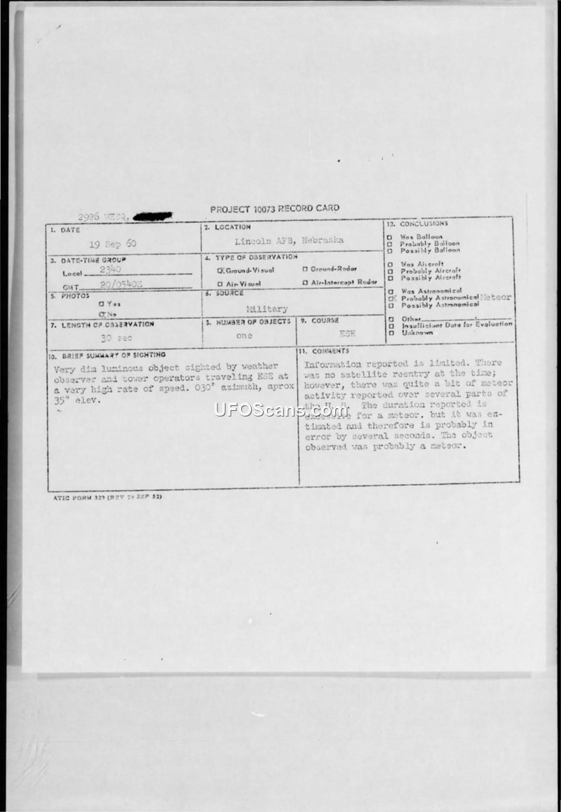 Project 10073 Record Card — Lincoln AFB, Nebraska, 19 September 1960