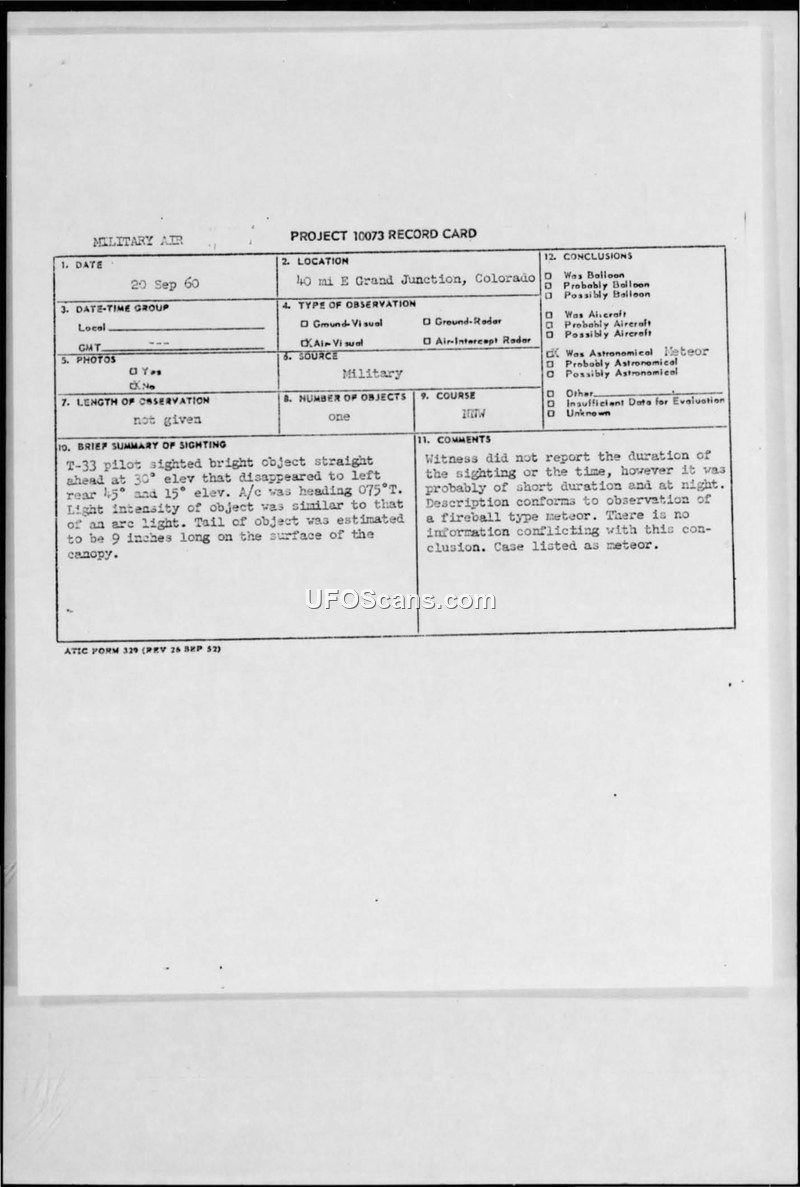 A T-33 pilot reported a bright, tail-bearing object near Grand Junction, Colorado, on September 20, 1960. The Air Force investigated the incident and concluded the object was a fireball-type meteor.