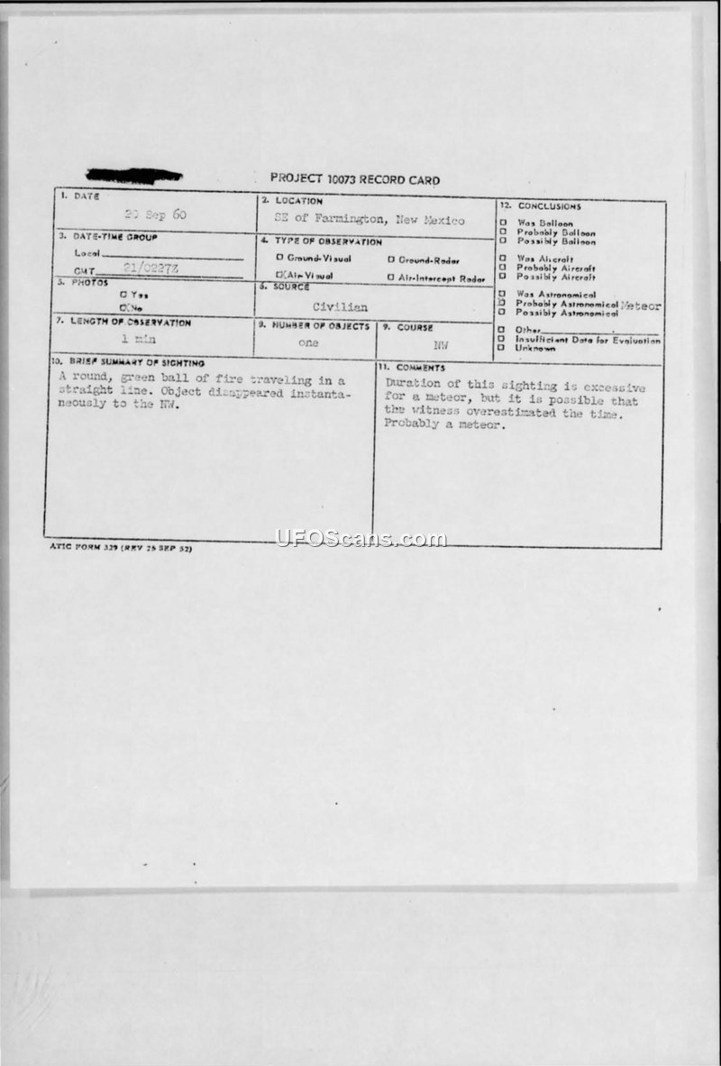 A pilot reported a green, round ball of fire over Farmington, New Mexico, on September 20, 1960. ATIC investigators concluded the object was likely a meteor.