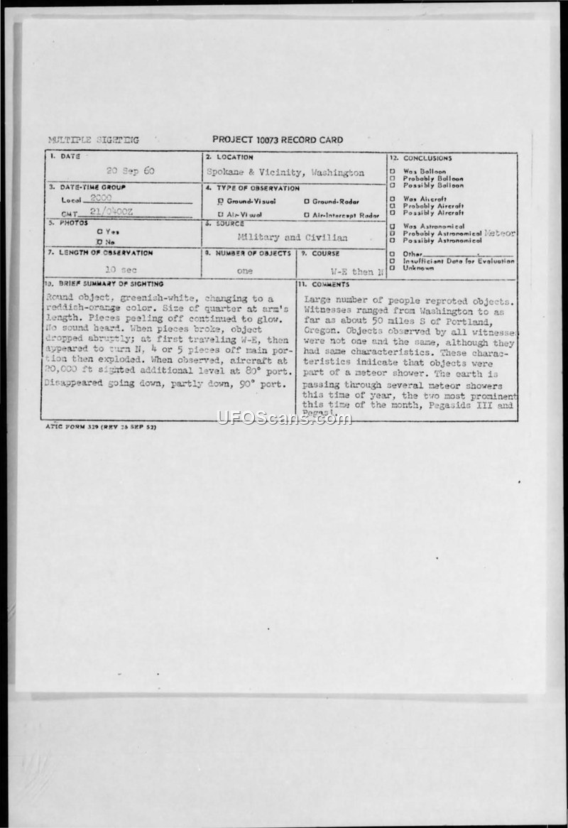 Three pilots observed a glowing, fragmenting object over Spokane, Washington, on September 20, 1960. The incident was investigated as a potential satellite or meteor event under the Moon Dust program.