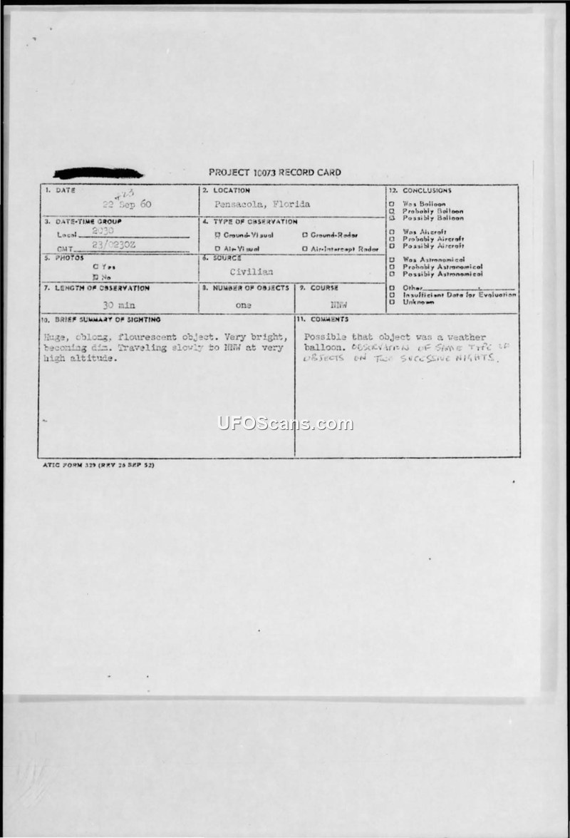 Project 10073 Record Card — Pensacola, Florida, September 1960