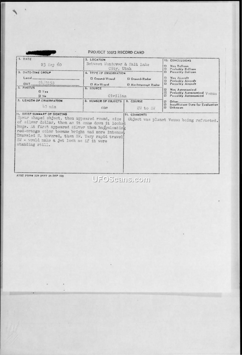 A civilian truck driver reported a pulsating, high-speed object in Utah on September 23, 1960. The Air Force officially concluded the sighting was the planet Venus being refracted.