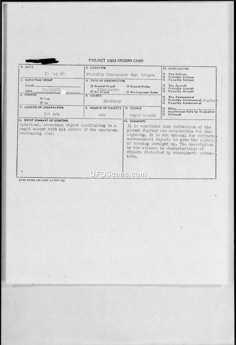 Project 10073 Record Card — Winchester Bay, Oregon, 23 September 1960