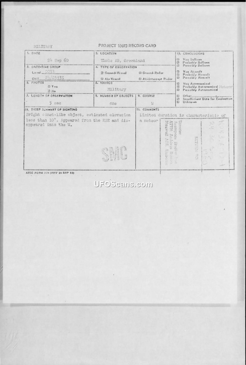 A report of a comet-like object sighted at Thule Air Base, Greenland, on September 24, 1960. The observation lasted five seconds and was officially attributed to a meteor.