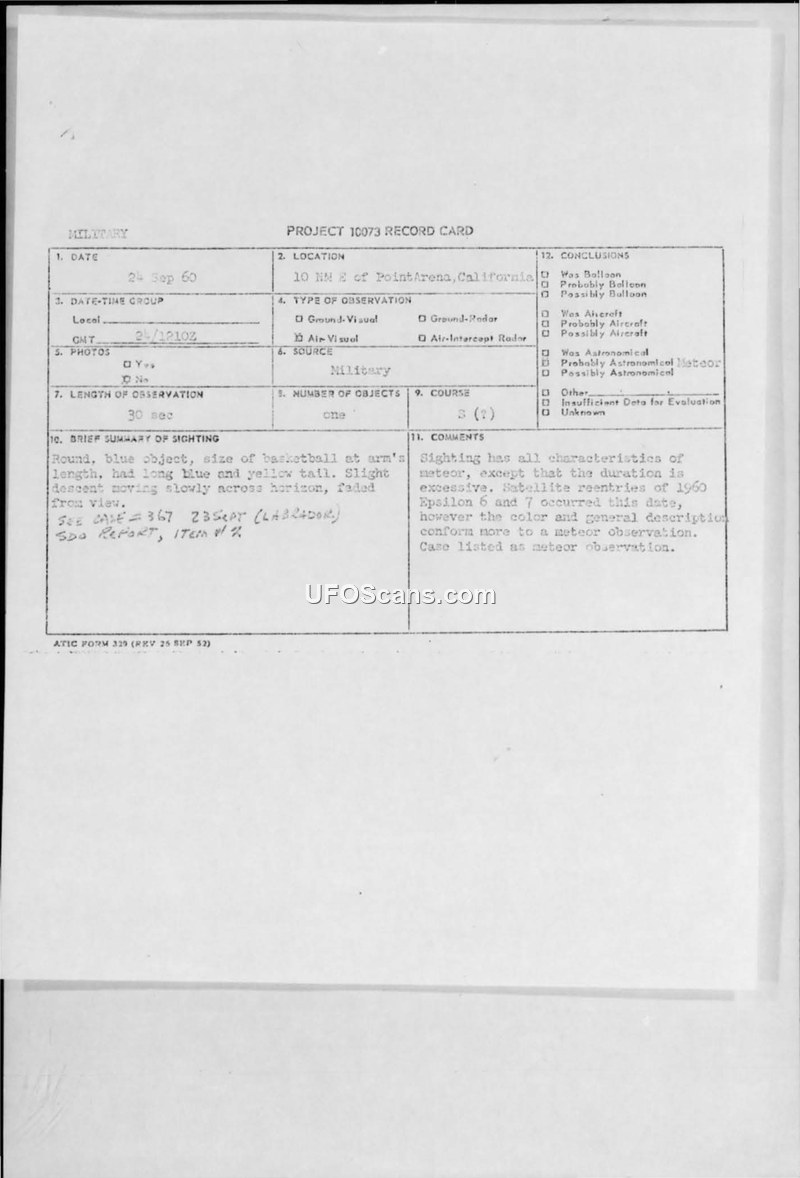 Project 10073 Record Card — 24 September 1960 Sighting, Point Arena, California