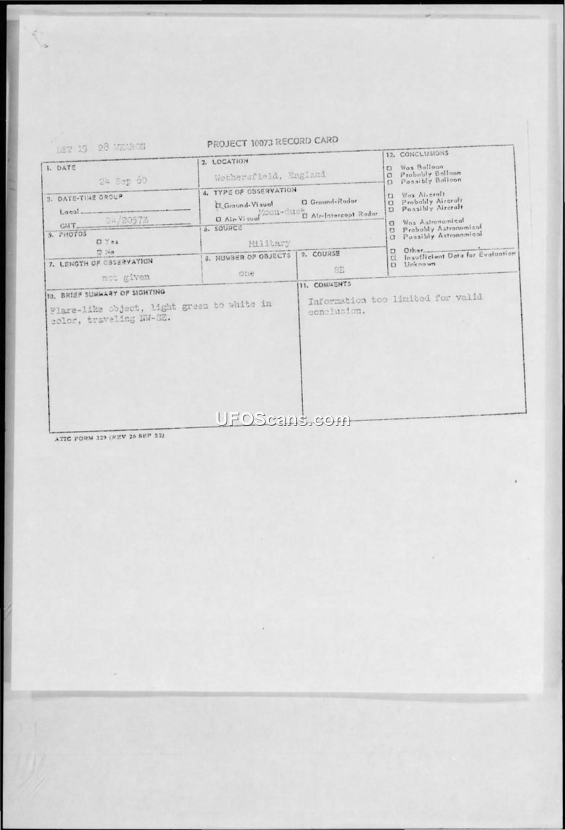 Project 10073 Record Card — Wethersfield, England, 24 Sep 60