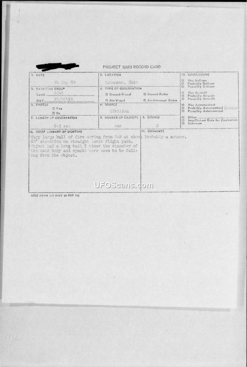 Project 10073 Record Card — Columbus, Ohio, 24 Sep 60