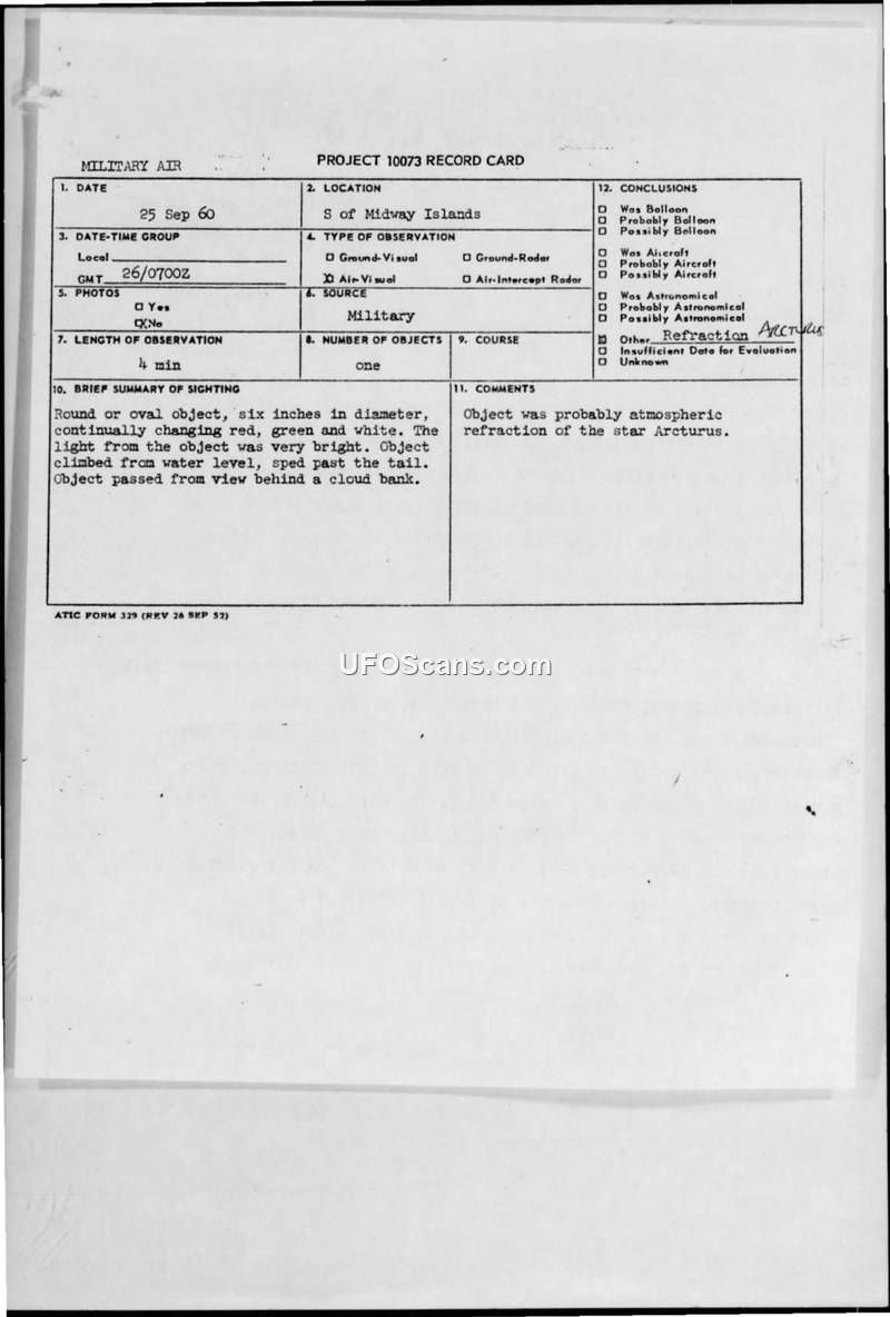 This document contains the official ATIC investigation into a 1960 military sighting of an unidentified object near Midway Islands. The investigation concluded the object was an atmospheric refraction of the star Arcturus.