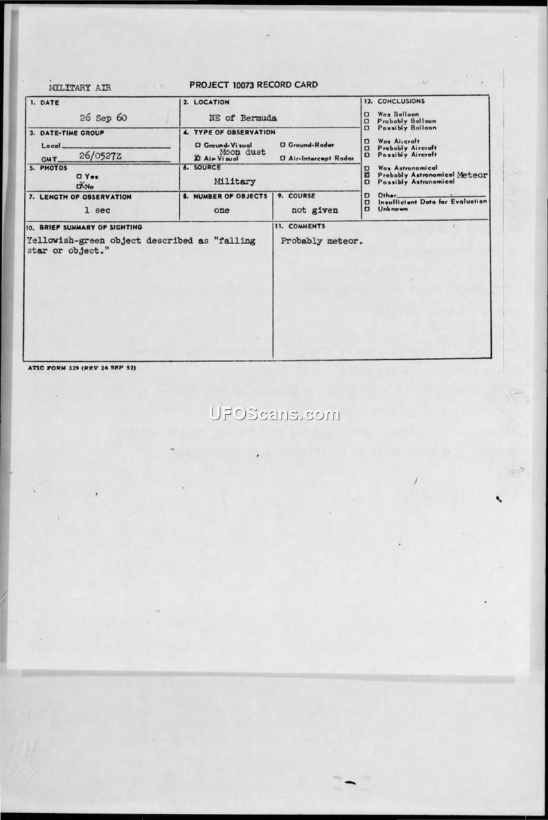 A report of a yellowish-green object sighted near Bermuda on September 26, 1960. The object was observed for one second and officially classified as a probable meteor.