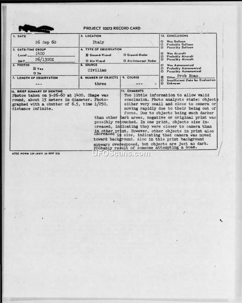 Project 10073 Record Card — Italy, 26 September 1960