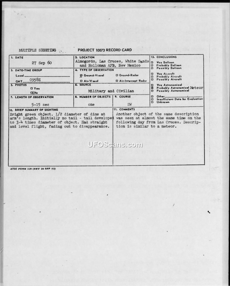 This document consists of a Project 10073 record card and a subsequent teletype report regarding a UFO sighting that occurred on September 27, 1960, in the vicinity of Alamogordo, Las Cruces, White Sands, and Holloman Air Force Base, New Mexico. The sighting involved a bright green, round object with a blunt tail that developed to three or four times the diameter of the object itself. Observers described the object as being approximately half the diameter of a dime held at arm's length. The object was observed for five to fifteen seconds, moving in a straight and level flight path before fading out of sight. Some observers noted an orange tinge on the outer edge of the tail. The investigation was conducted by Captain Jack H. Patterson, the Unidentified Flying Objects Investigation Officer for the Air Force Missile Development Center (AFMDC). Captain Patterson interviewed four reliable witnesses from the affected locations 24 hours after the event. While one observer at Las Cruces reported that the object hovered, the investigation officer concluded that this was likely an optical illusion resulting from the relative motion of the UFO against stationary objects as viewed from a maneuvering vehicle. Furthermore, the officer posited that the object was likely at a greater distance, altitude, and speed than the witnesses initially perceived, noting that all witnesses pointed to a location 10 to 15 degrees to the left of the North Star. Despite the investigation, no definitive conclusion was reached regarding the nature of the object. The report includes detailed meteorological data for the area, confirming unlimited visibility at the time of the sighting.