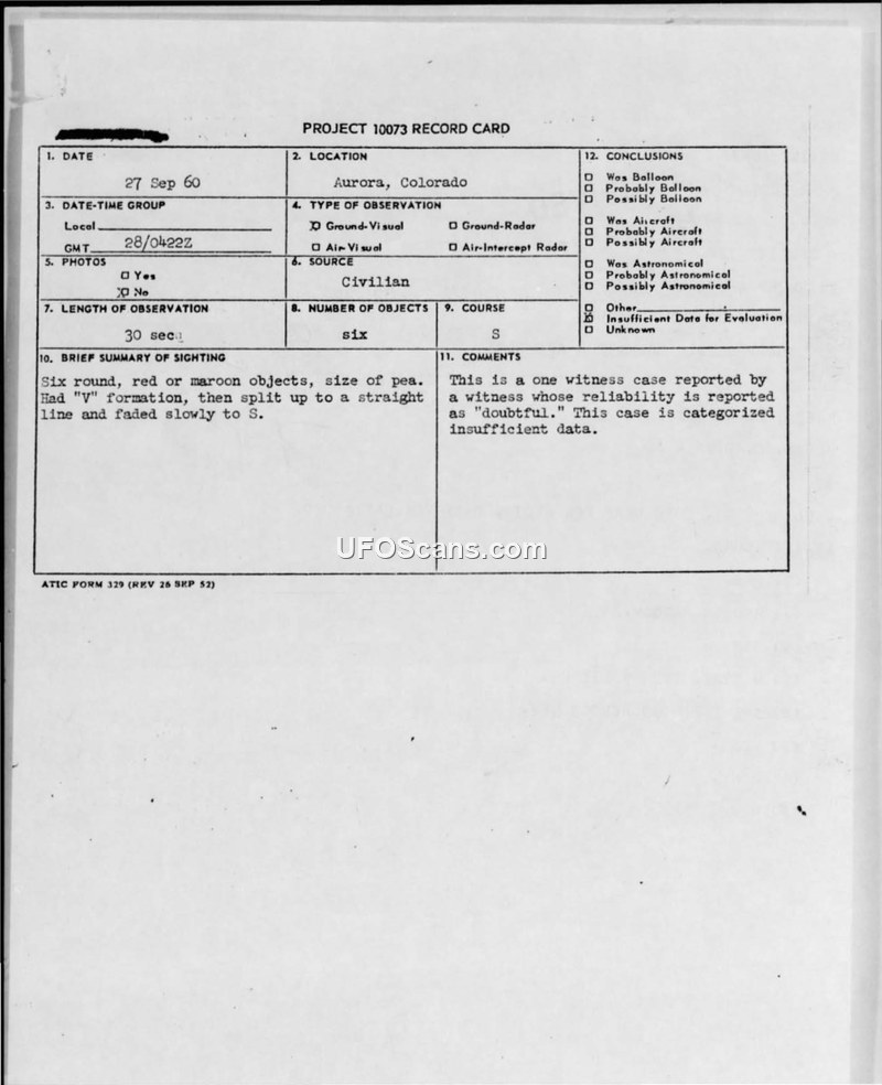 Project 10073 Record Card — Aurora, Colorado, 27 September 1960