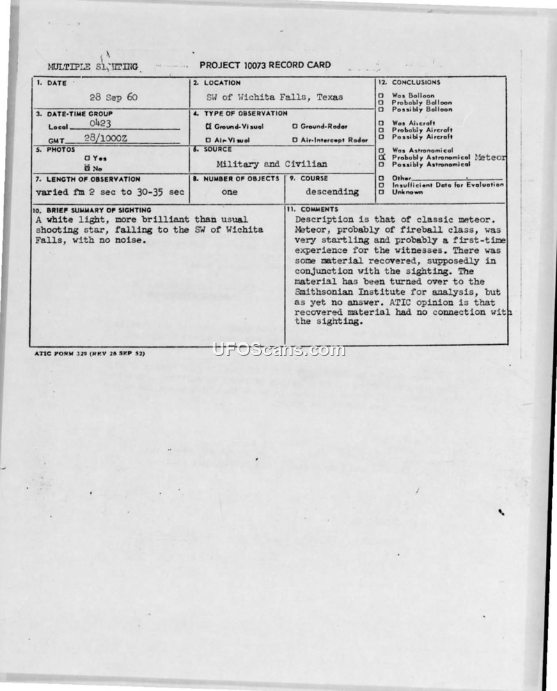 On 28 September 1960, at approximately 0424 hours local time, numerous witnesses in the vicinity of Wichita Falls, Texas, observed a bright, falling object in the sky. Reports from various observers, including police officers, a truck driver, and military personnel, described a white or blue-white light, sometimes with a greenish tint, that appeared to fall toward the ground. The duration of the sightings varied significantly, from 2 seconds to over 30 seconds. Despite extensive searches conducted by local police and a helicopter from Fort Sill, Oklahoma, no impact site or object was located. One witness, a housewife in Wichita Falls, reported observing material falling from the sky at 0800 hours that same morning. She collected a sample, which she described as having a rubber-like quality that shrank upon contact. This material was forwarded to the Smithsonian Institute for analysis. The Air Technical Intelligence Center (ATIC) and the 1127th USAF Field Activities Group investigated the incident. The consensus among investigators was that the primary sighting was a classic meteor or fireball of unusual brilliance that likely burned up in the atmosphere. Regarding the recovered material, investigators tentatively concluded it was likely floating spider web material and bore no connection to the meteor sighting. The report emphasizes that the lack of noise reported by all witnesses suggests the object was at a much greater distance than initially estimated by observers, who were scattered across a wide area. The investigation concluded that the object did not land in the immediate vicinity of Wichita Falls.