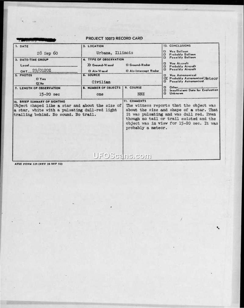 Project 10073 Record Card — Urbana, Illinois, 28 September 1960