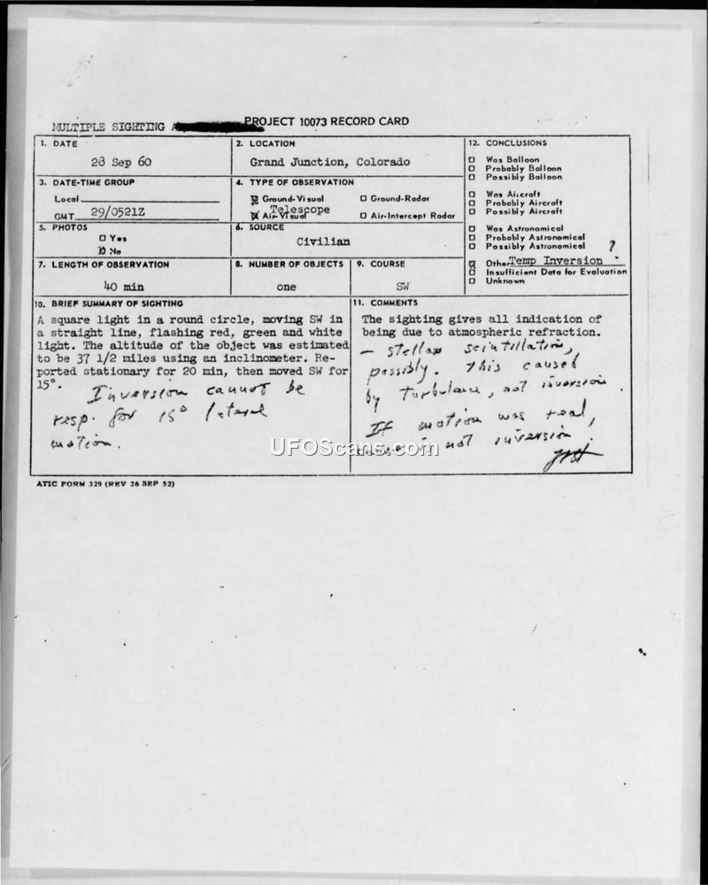 This document collection details an unidentified aerial phenomenon (UAP) sighting reported on 28 September 1960, involving observers in Grand Junction, Colorado, Farmington, New Mexico, and Eagle, Colorado. The primary report describes a square light within a round circle, displaying red, green, and white flashing lights. The object was reported to be stationary for approximately 20 minutes before moving southwest. Witnesses utilized a theodolite to estimate the object's altitude at 37.5 miles. The report was processed by the Air Technical Intelligence Center (ATIC) under Project 10073. Following an investigation, which included obtaining weather data from the Air Weather Service, ATIC concluded that the sighting was not an anomalous craft but rather an atmospheric phenomenon. Specifically, investigators identified a temperature inversion present on the date of the sighting. They argued that this inversion caused light refraction, leading to 'looming mirages' and geometric inconsistencies in the triangulation performed by the witnesses. The official assessment states that the inversion was responsible for the misidentification of common objects and errors in determining their actual location. The file includes internal military communications, a record card, and correspondence regarding the transmission of weather records to support the analysis.