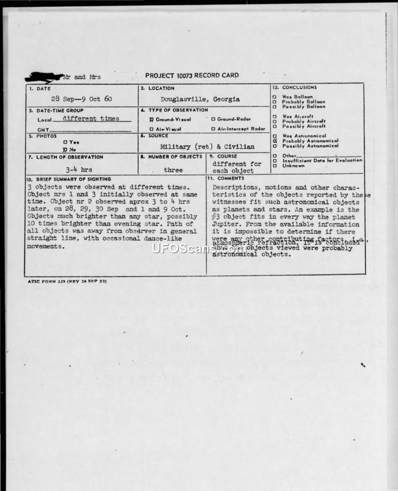 A retired USAF Master Sergeant reported three bright, moving objects near Douglasville, Georgia, in late 1960. Military investigators concluded the objects were likely astronomical in nature, specifically citing planets and stars.