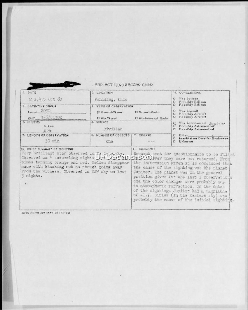 This document contains a Project 10073 record card and associated correspondence regarding a series of UFO sightings reported by a resident of Paulding, Ohio, in October 1960. The witness reported observing a 'very brilliant star' in the Eastern sky over four consecutive nights, beginning on October 2, 1960. The object was described as turning orange and red before suddenly disappearing or 'blacking out.' The witness noted that the object was seen by her husband, daughter, and in-laws, and that neighbors had also observed it. The witness contacted the Air Force for an explanation, expressing curiosity about whether the phenomenon was 'top secret.' The Aerospace Technical Intelligence Center (ATIC) at Wright-Patterson Air Force Base responded to the witness on October 19, 1960, via Lt. Colonel Lawrence J. Tacker. The Air Force concluded that the information provided was insufficient for a valid evaluation and requested that the witness complete an ATIC Form #164 questionnaire. However, the internal ATIC assessment, signed by Colonel Philip G. Evans, noted that the sightings were likely attributable to the planet Jupiter, which was in the general position described and had a magnitude of -1.7. The Air Force suggested that the reported color changes were likely the result of atmospheric refraction. The record card indicates that the requested questionnaires were never returned by the witness.
