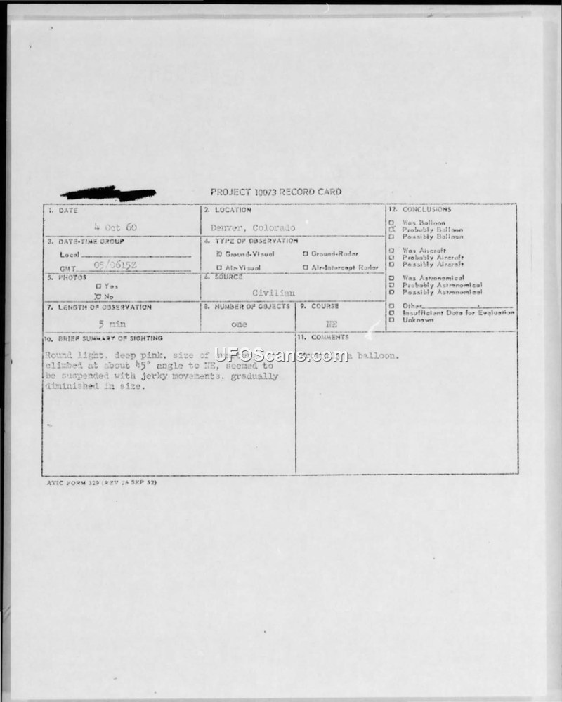 This document contains records and correspondence regarding two separate UFO sightings in Denver, Colorado, in October 1960, processed under Project 10073. The first incident occurred on October 4, 1960, involving a round, deep pink object the size of a quarter. The witness, a reproduction technician, observed the object climbing at a 45-degree angle toward the northeast with jerky movements for approximately five minutes. Military investigations noted that Stapleton Airfield was nearby and suggested the object might have been a jet airliner, though no IFF traffic was logged at the time. The official conclusion for this event was 'probably a balloon.' The second incident occurred on October 8, 1960, involving a bright white object with a red light on top, described as shaped like a cereal bowl. The witness, a student, observed the object hovering, climbing, and gaining speed before disappearing rapidly to the west. The duration of this observation was 15 minutes. ATIC investigators noted that the object possessed characteristics of a helicopter, including hovering and an anti-collision light, but concluded that there was insufficient data to reach a valid conclusion. A follow-up request for more information regarding the October 8th sighting was sent to the witness, but no reply was received. The document includes official record cards, teletype messages between ATIC and Lowry AFB, and a formal request for further information from the Air Force Intelligence Center.