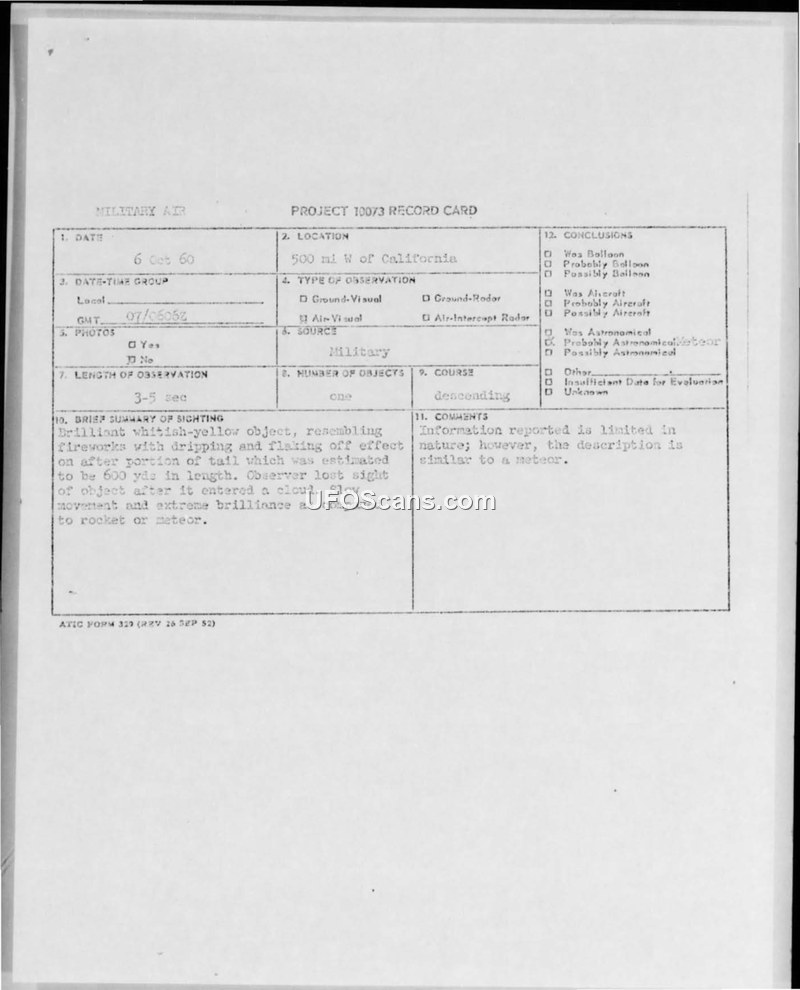 This document consists of a Project 10073 Record Card and a supporting Naval Message detailing an Unidentified Aerial Phenomena (UAP) sighting that occurred on October 6, 1960. The incident took place at 0705Z, approximately 500 miles west of California at coordinates 43-00N 134-28W. The witnesses, a flight crew consisting of a pilot, copilot, and two crewmen, observed a brilliant, whitish-yellow object while flying at an altitude of 2,500 feet. The object was described as resembling fireworks, with a 'dripping and flaking off' effect on the tail portion, which was estimated to be 600 yards in length. The crew reported that the object was moving slowly and was descending. The pilot, noted in the report as having extensive experience with flight and airborne pyrotechnics, remarked on the object's extreme brilliance compared to a rocket or a falling star. The object was observed for approximately 3 to 5 seconds before it entered a cloud and was not seen again. The official conclusion recorded on the Project 10073 card states that the information is limited in nature, but the description is similar to that of a meteor. The Naval Message, which served as the source for the record card, was addressed to various military commands, including CINCPAC and CINCONAD, indicating the high-level distribution of the report within the military hierarchy at the time. The document is marked as unclassified and includes a note that an advance copy was delivered to CIN.