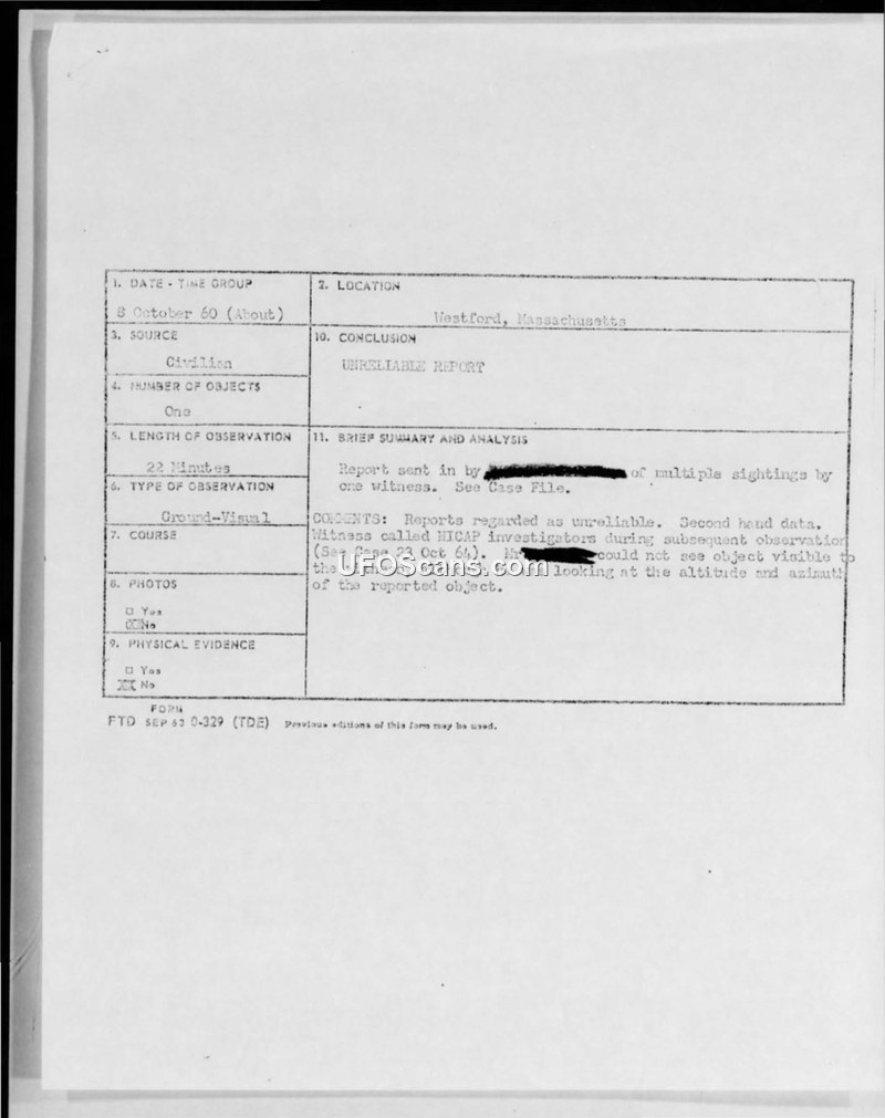UFO Sighting Report — Westford, Massachusetts, October 1960
