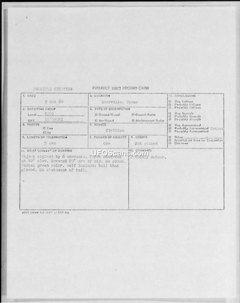Project 10073 Record Card: Sighting at Kerrville, Texas, 9 October 1960