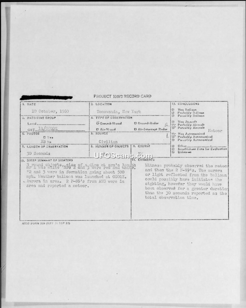 Project 10073 Record Card — Tonawanda, New York, 10 October 1960