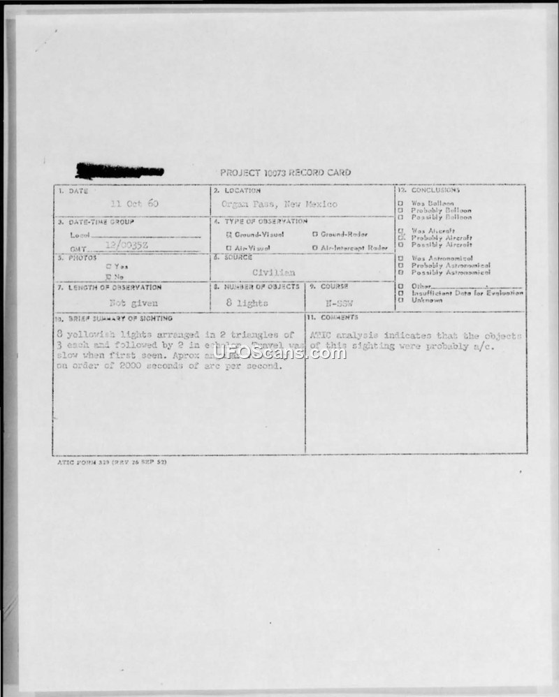Project 10073 Record Card: Sighting at Organ Pass, New Mexico, 12 October 1960
