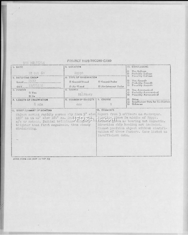 A 1960 sighting report from a US Navy destroyer in Egypt describes an unidentified object moving rapidly across the sky. The case was officially closed as having insufficient data for evaluation.