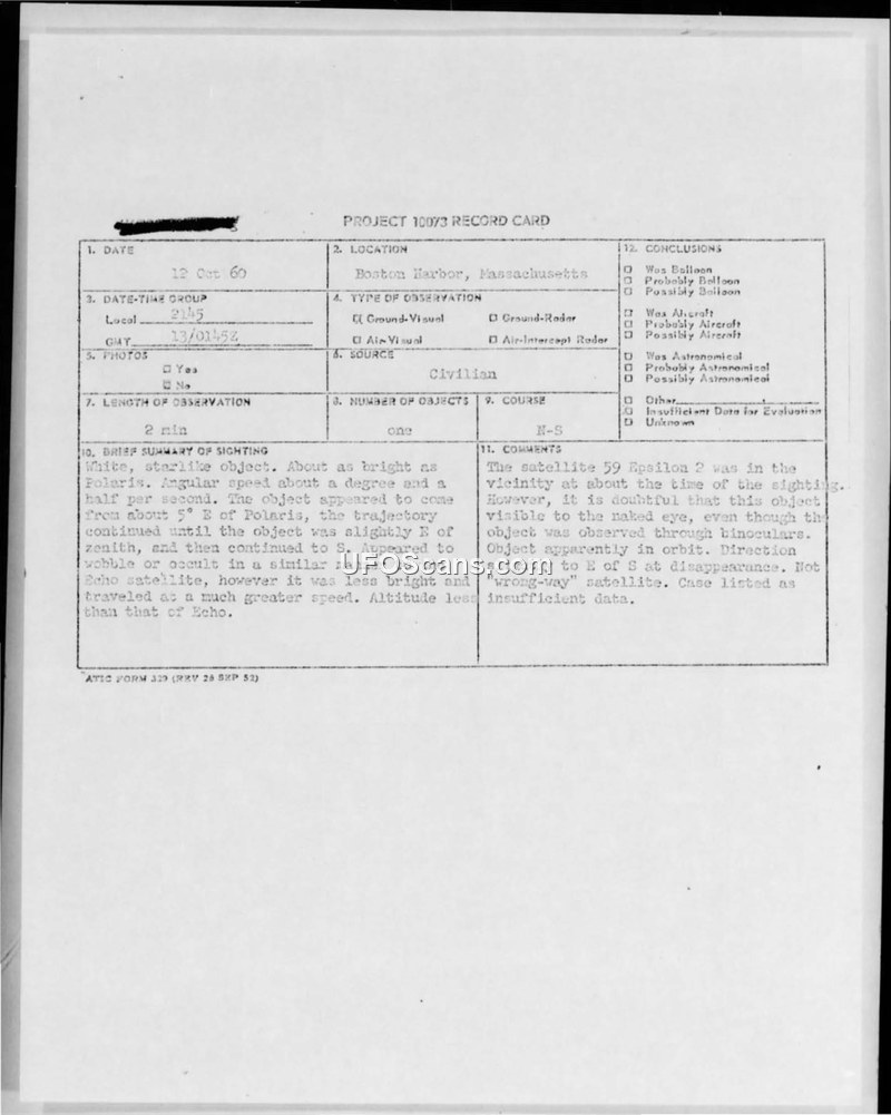 A sighting of a white, starlike object in Boston Harbor on October 12, 1960, was investigated under Project 10073. The case was ultimately classified as having insufficient data, with internal notes questioning the accuracy of the observer's timing.