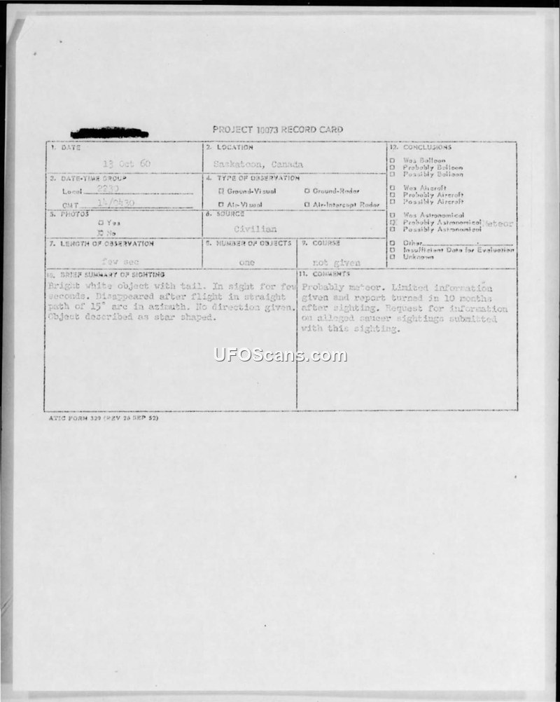 A 15-year-old witness reported a star-shaped object with a tail in Saskatoon, Canada, on October 13, 1960. Authorities concluded the object was likely a meteor due to the brief duration and the ten-month delay in reporting.