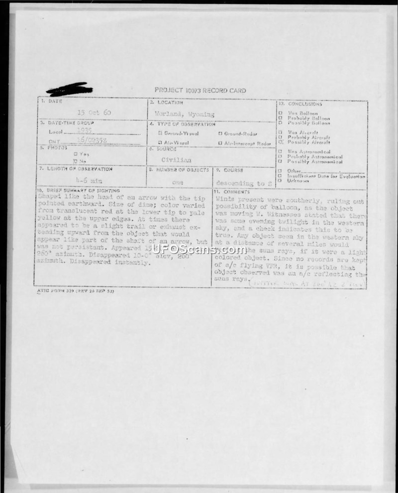 Project 10073 Record Card — Worland, Wyoming, 15 October 1960