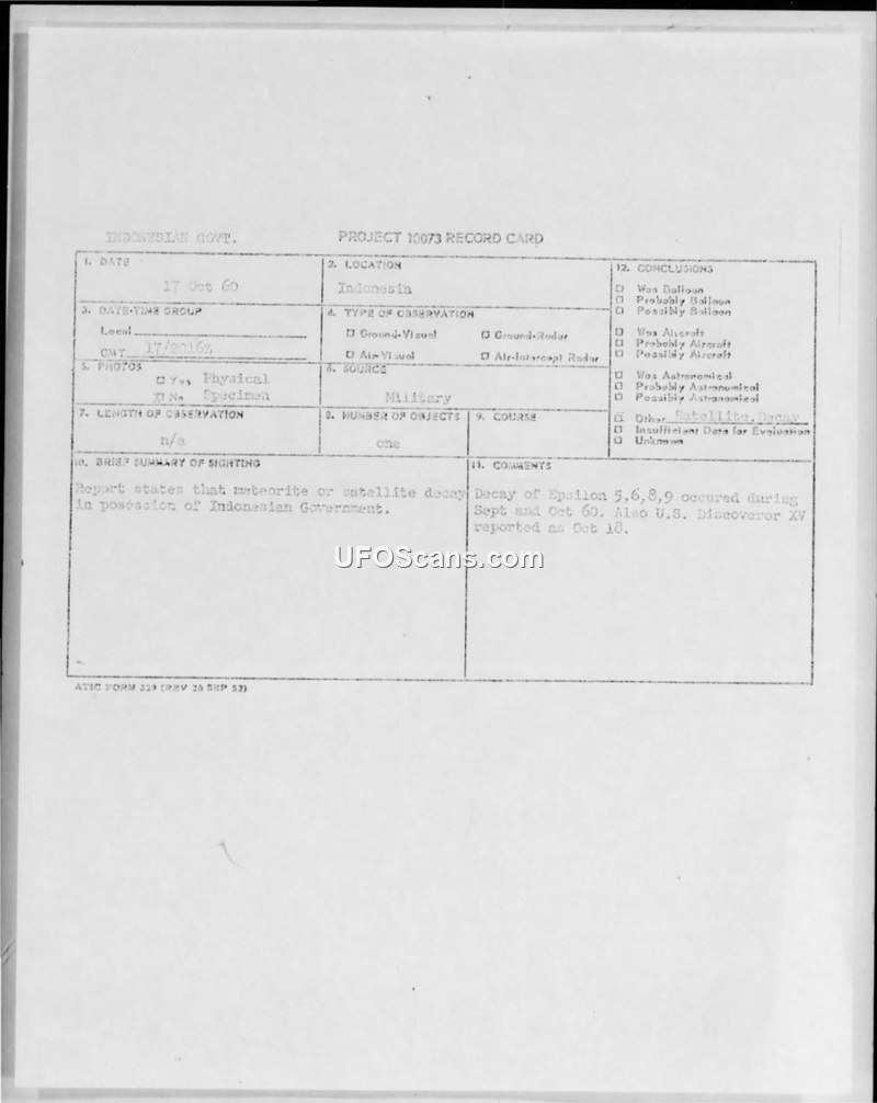 Project 10073 Record Card — Indonesia, 17 Oct 60