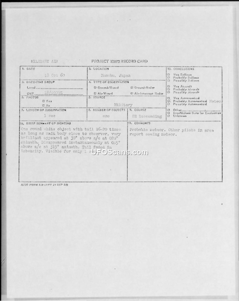 Military pilots over Honshu, Japan, reported a brilliant, round, white object with a long tail on October 18, 1960. The sighting was officially classified as a probable meteor after corroboration from other pilots in the area.