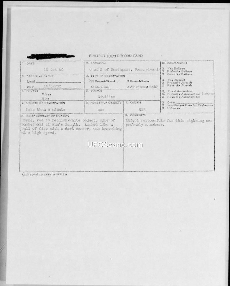 A civilian reported a round, red, high-speed object near Smethport, Pennsylvania, on 18 October 1950. Air Force investigators concluded the object was likely a meteor after finding no evidence of a crash.