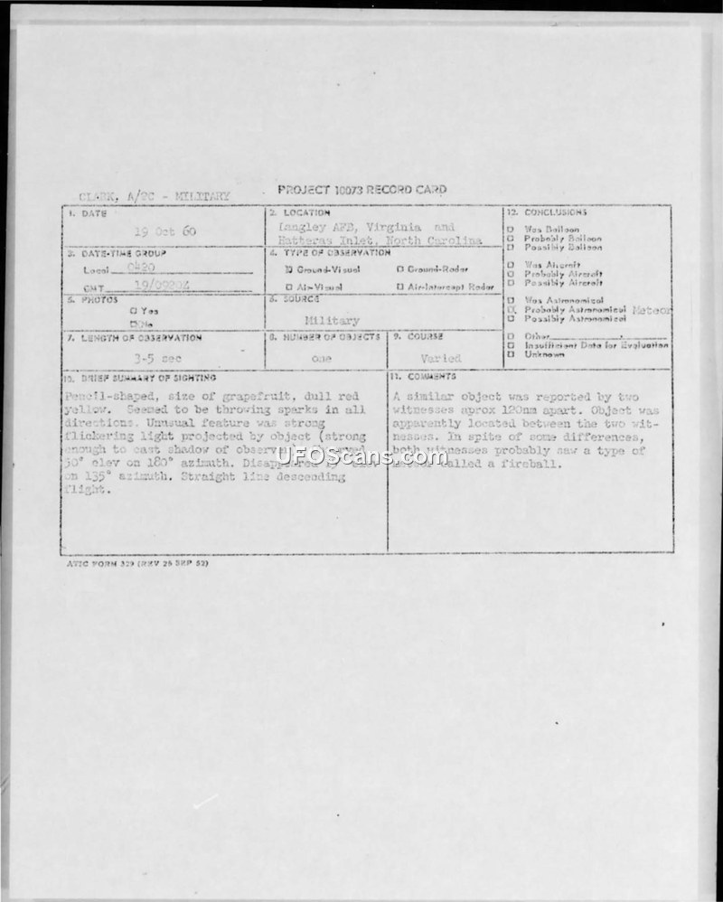 Project 10073 Record Card: Sighting at Langley AFB and Hatteras Inlet, 19 October 1960