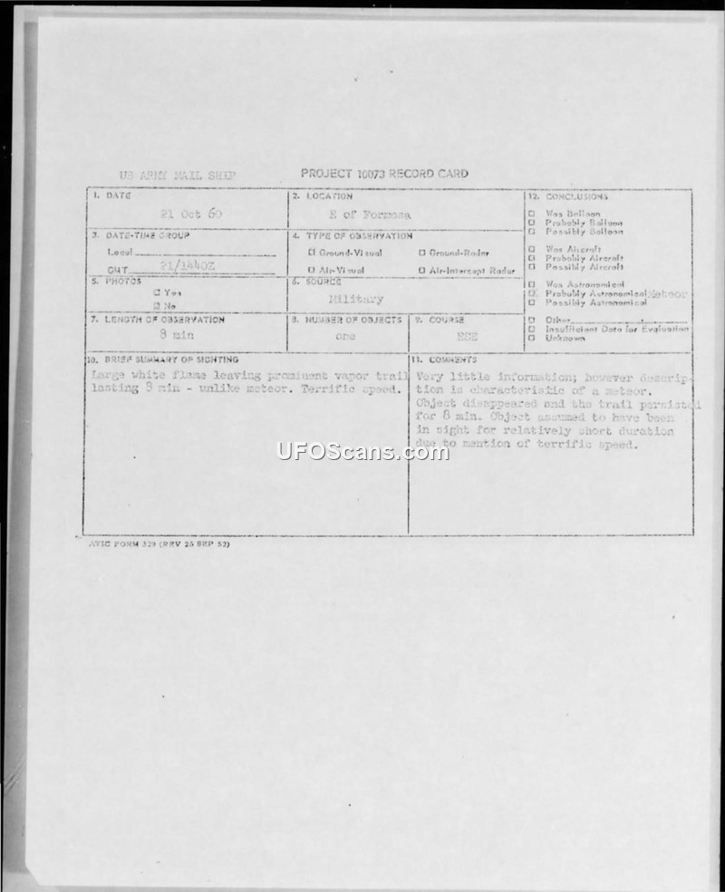 Project 10073 Record Card — Sighting near Formosa, 21 October 1960