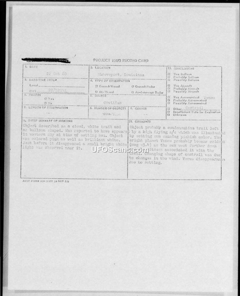 A witness reported an unidentified object near Shreveport, Louisiana, on October 22, 1960. The Air Force concluded the sighting was a condensation trail and the planet Venus.