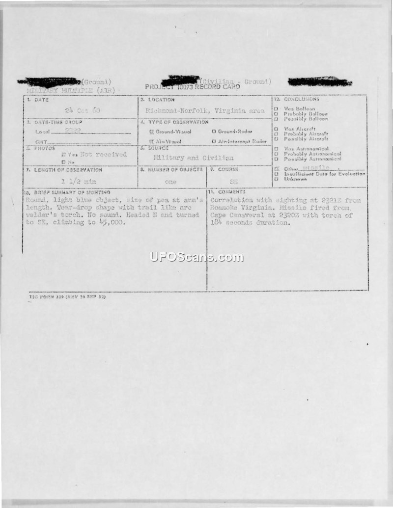 A series of UFO sightings in Virginia and North Carolina on October 24, 1960, were investigated by the Air Force. While initially suspected to be a missile launch from Cape Canaveral, the claim was denied by NASA/Wallop Island officials.
