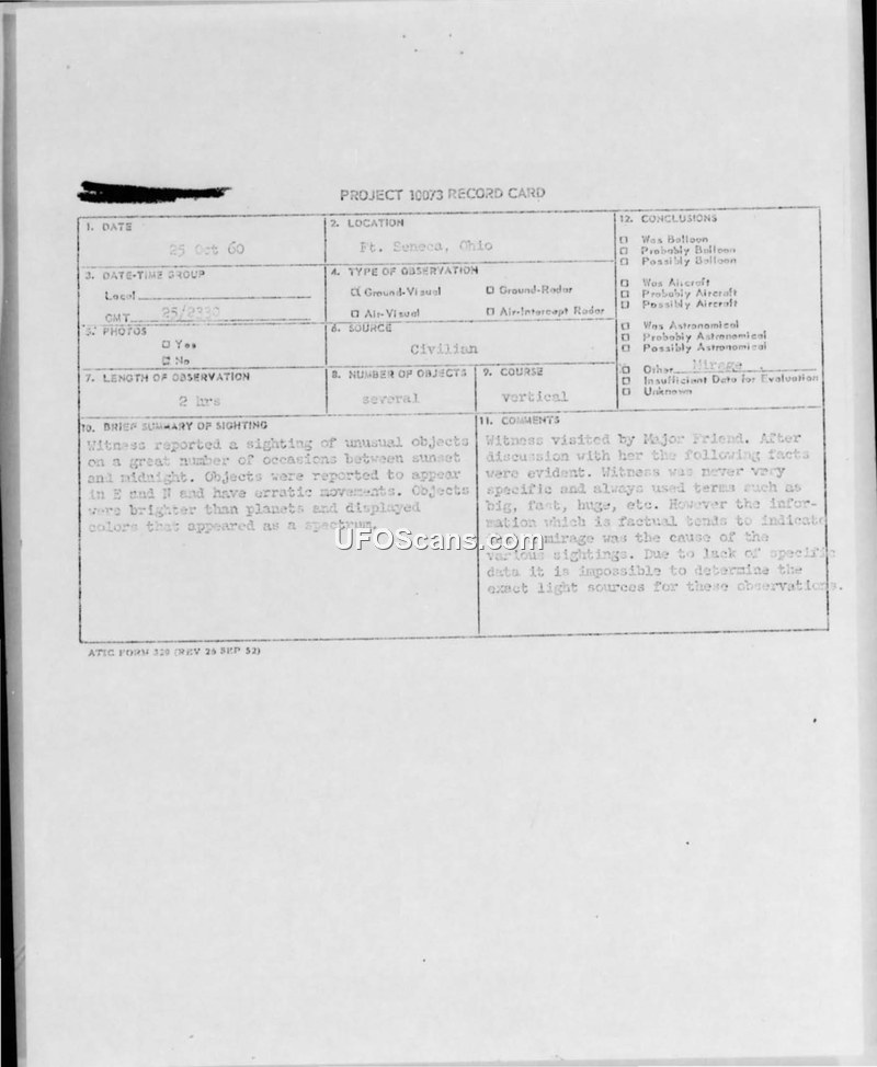 A series of UFO sightings in Ft. Seneca, Ohio, in 1960 were investigated by the Air Force. The official conclusion was that the objects were likely mirages of stars or planets, attributed to the witness's high-strung nature.