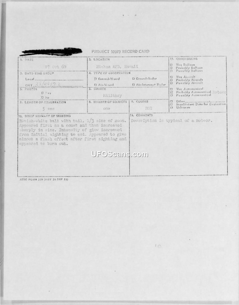 Project 10073 Record Card and UFO Report — Hickam AFB, Hawaii, 28 October 1960