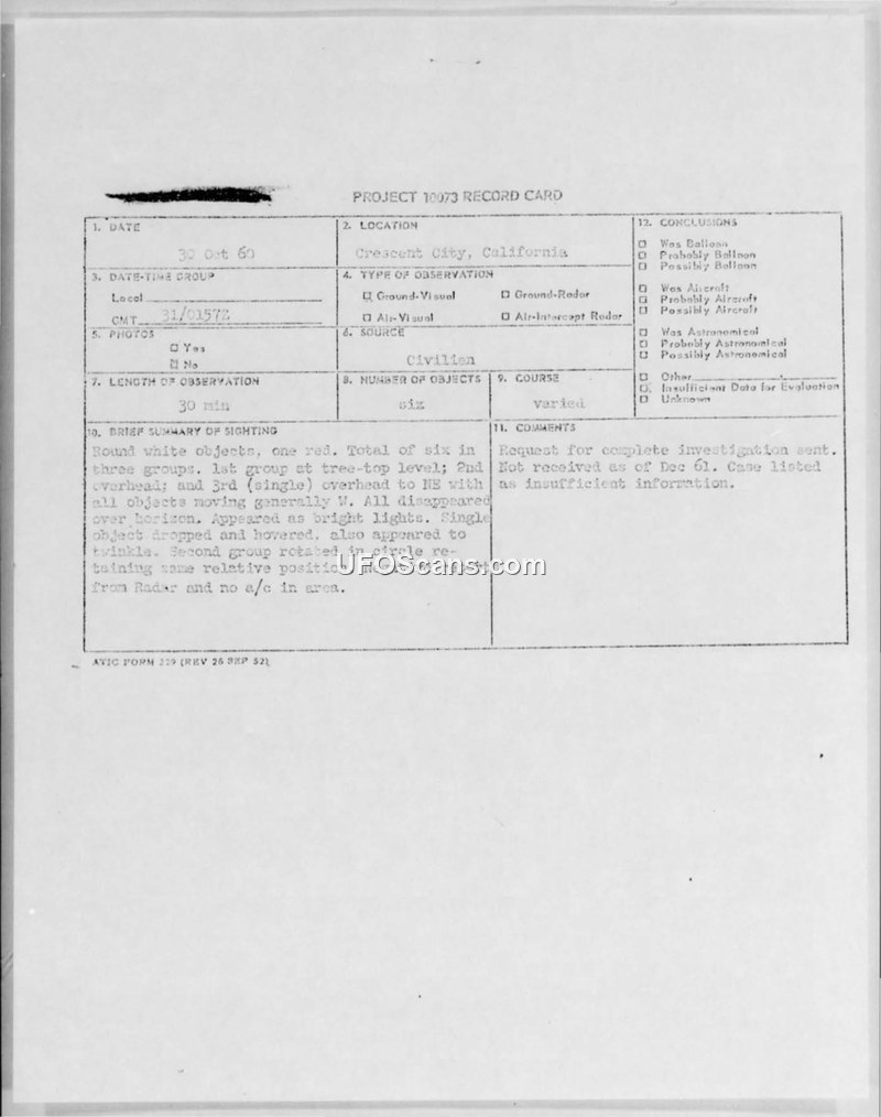 A 1960 sighting of six unidentified objects in Crescent City, California, was reported by multiple witnesses. Despite investigation by ATIC, the case remained unresolved due to insufficient information.