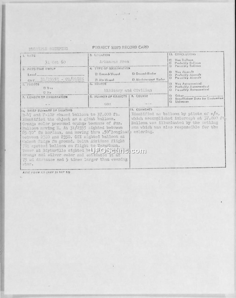 This document is a comprehensive compilation of UFO and UAP sighting reports from November 1960, maintained under the auspices of Project 10073. The file includes various record cards, correspondence, and press clippings detailing reports from across the United States and international locations, including Burma and Japan. The records reflect the Air Force's systematic attempt to categorize these sightings, with many being evaluated as 'Astro' (meteor), 'Balloon', or 'Aircraft'. Notable entries include a report from Miles City, Montana, where witnesses observed an object initially described as a 'flying saucer' but later identified as a balloon by military pilots. Another section contains correspondence from Donald H. Menzel of the Harvard College Observatory, who dismisses the existence of non-terrestrial UFOs, asserting that official files contain no evidence to support such claims. The document also includes detailed sighting reports from individuals, such as a 17-year-old in Rye, New York, who described an orange-red object that appeared to change size and color. The compilation serves as a record of the public and military interest in aerial phenomena during this period, highlighting the tension between civilian reports and official military evaluations. The document concludes with various 'No Case' entries, which are provided for information only, indicating that these reports were either not investigated or were determined to be of no intelligence value. The overall tone of the military correspondence is one of skepticism, consistently seeking conventional explanations for the reported phenomena.